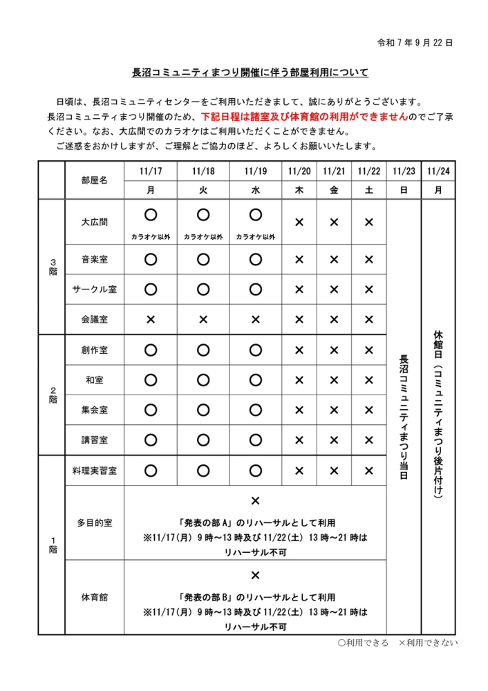 下記日程は、「長沼コミュニティまつり」開催のため、諸室及び体育館をご利用いただくことができません。