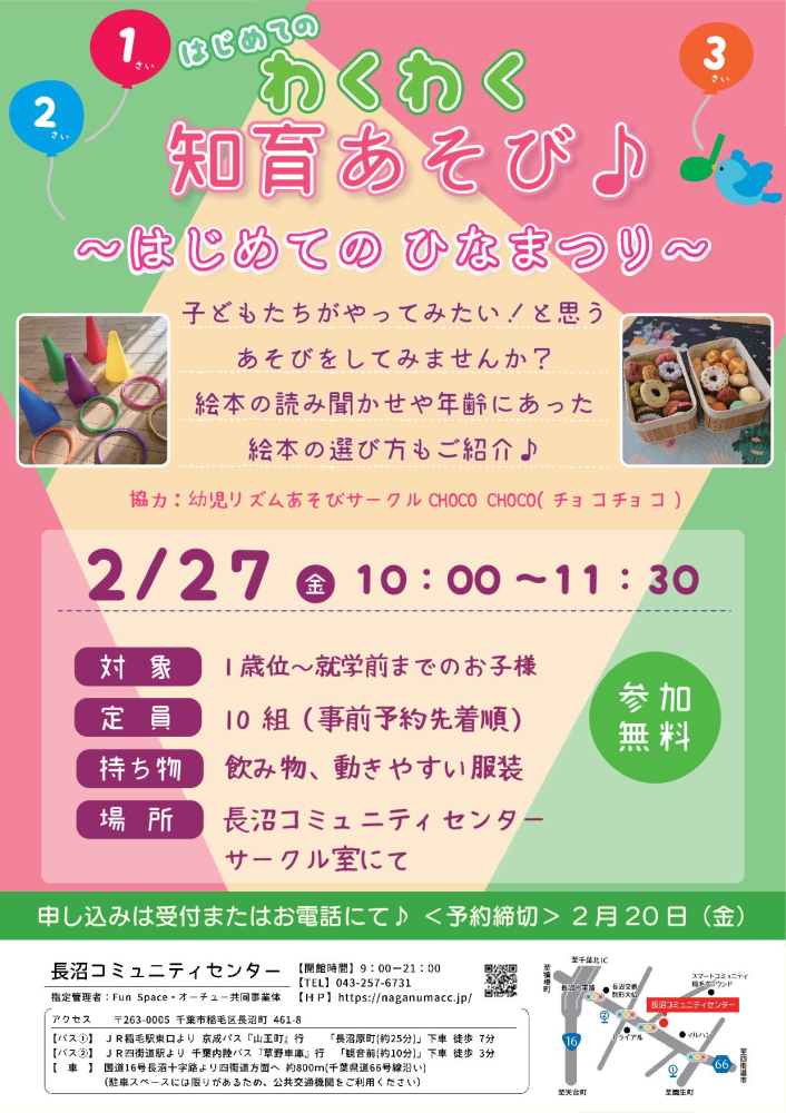 | 対象/定員 | 1歳位~未就学児/10組(事前予約先着順) |