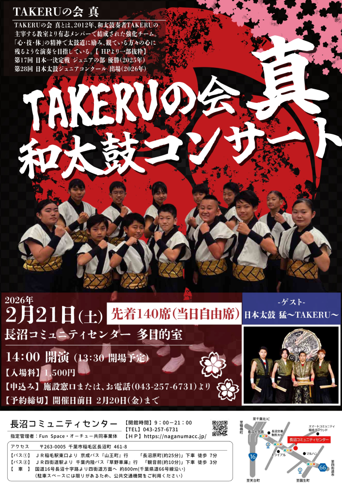 イベント情報 , 2026年01月09日和太鼓チーム「TAKERUの会 真」によるコンサートを開催します。