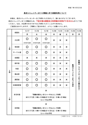 日頃より、長沼コミュニティセンターをご利用いただき、誠にありがとうございます。下記日程は、「長沼コミュニティまつり」開催のため、諸室及び体育館をご...
