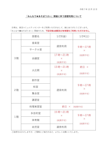 みんなで★あそぼうさい開催に伴う諸室及び体育館の利用制限について